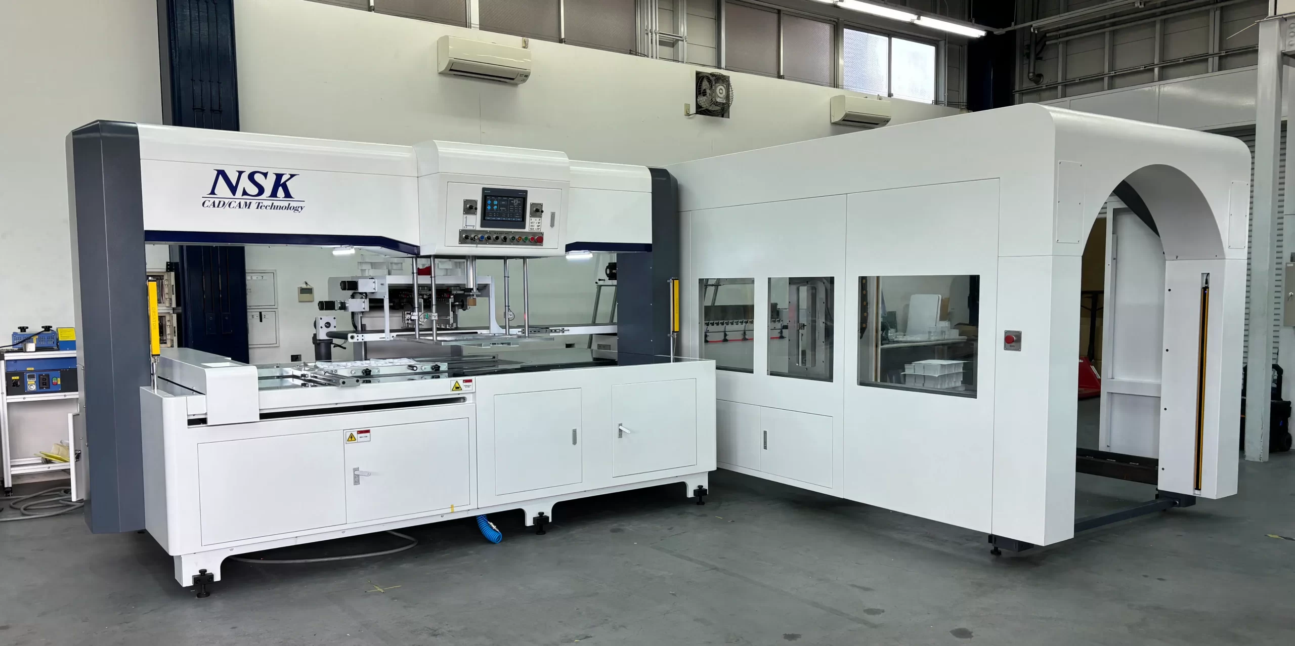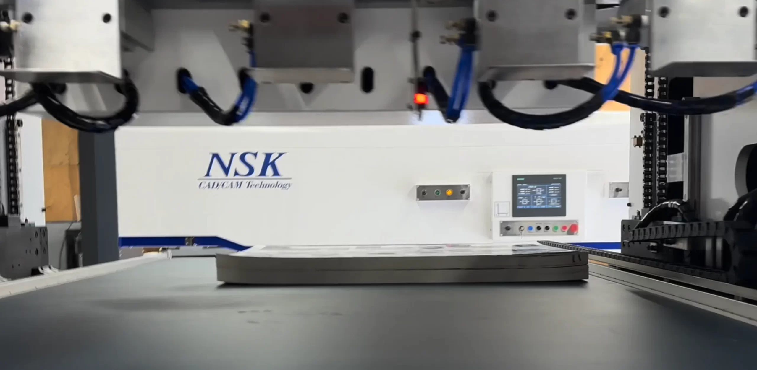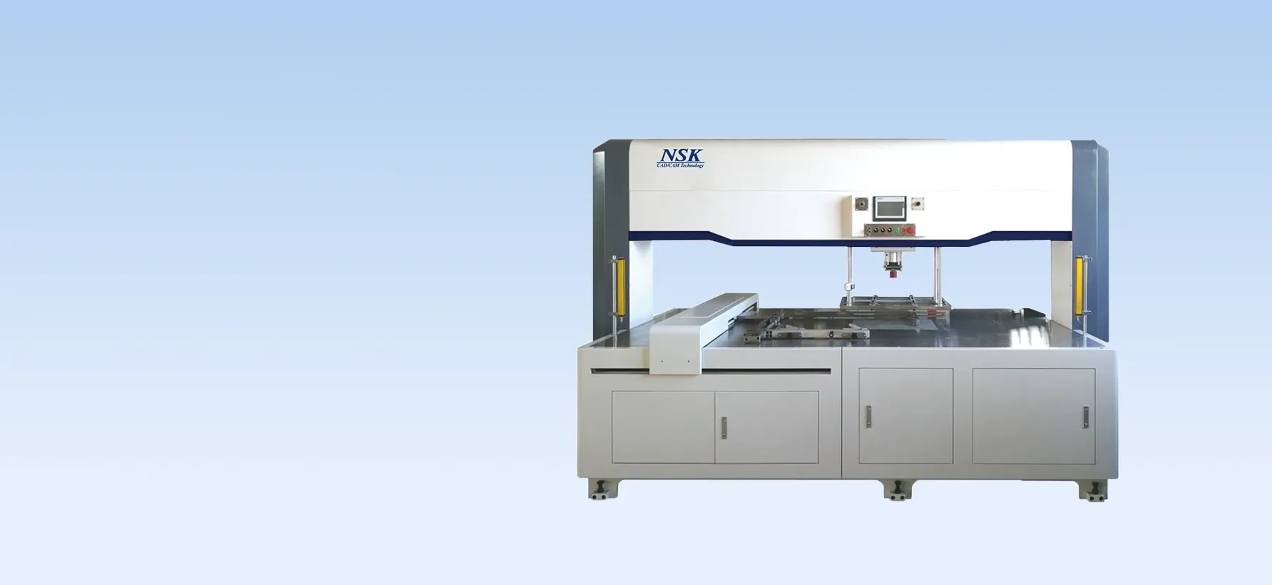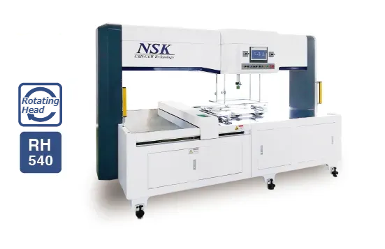 A twin-head model suited for blanking designs with nesting and fixtures, and for designs needing setups with different patterns. Its strong point is its flexibility to accommodate various types of designs.